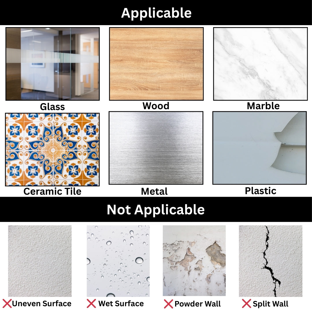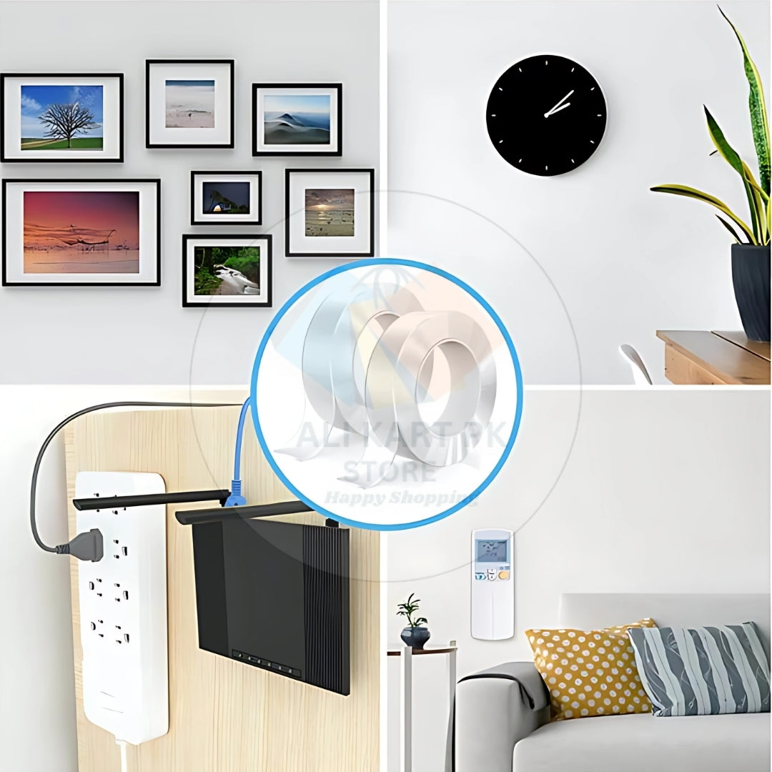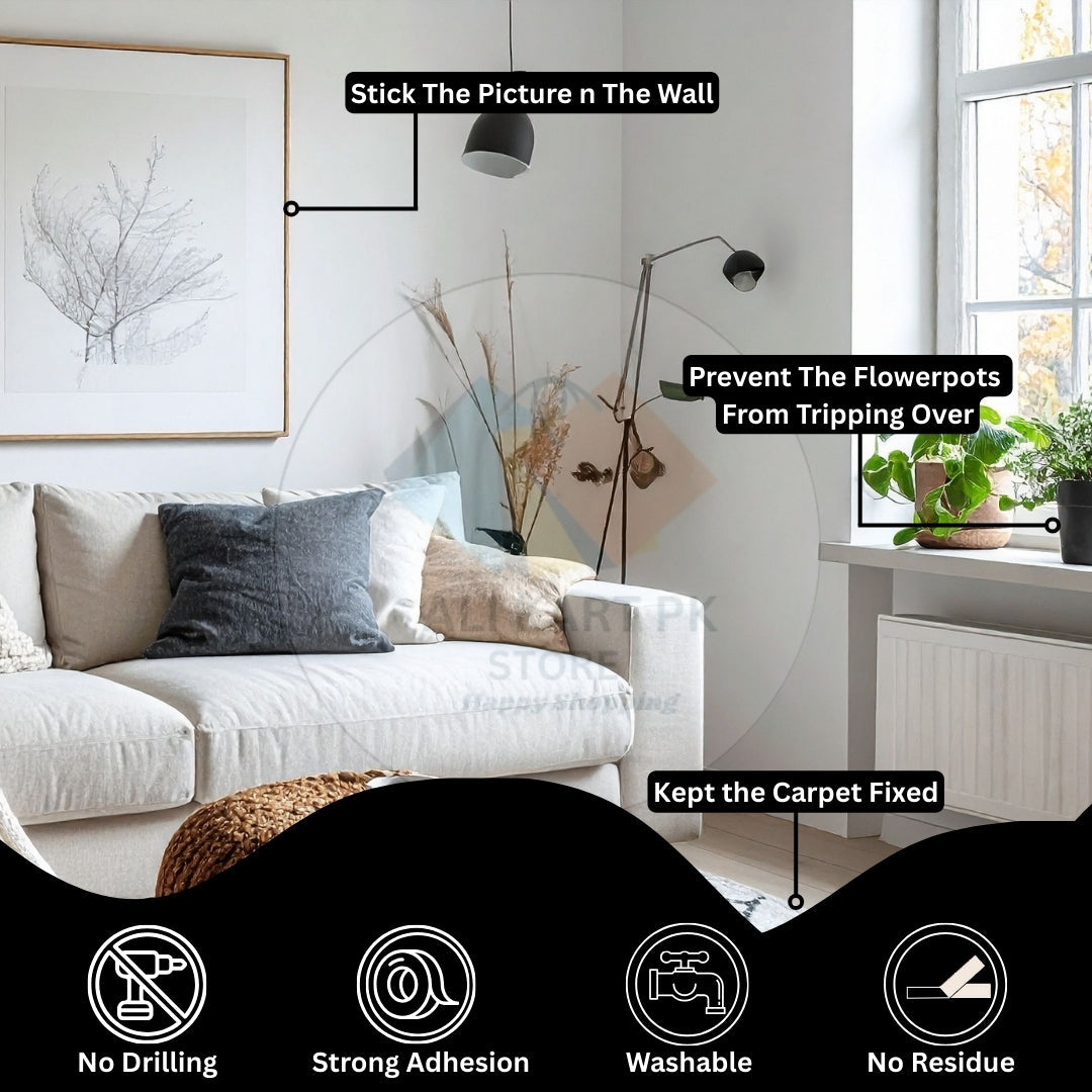 This double sided tape will stick to almost anything with a smooth surface so you can stick anything anywhere. You can use it to fix or paste items such as frames, carpets, power sockets and remote controls etc